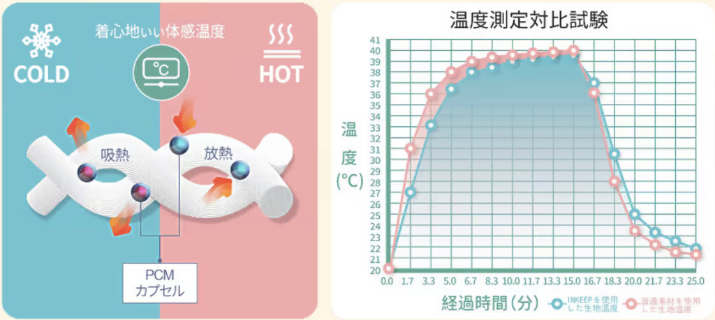 温度が上がると熱を吸収し、下がると蓄えるといった、体温に合わせて自動調整する機能