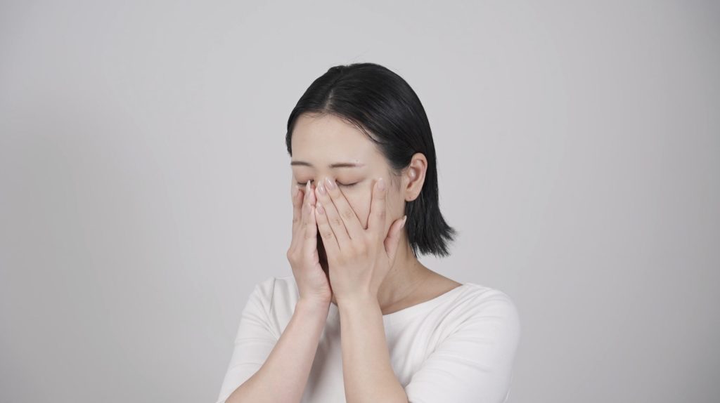 お顔を優しく包み込むように、手のひら全体を使って馴染ませていきます。肌に押し込むのではなく、やさしくプレスするように馴染ませることがポイントです。