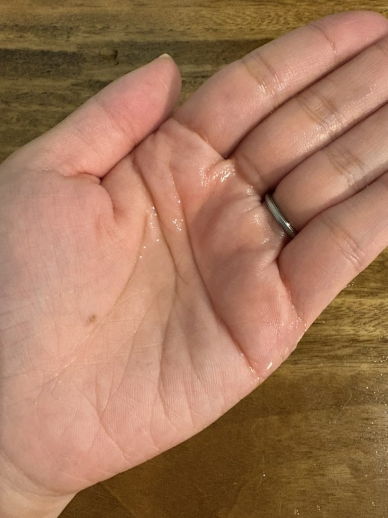 パキッと折ると中から透明の美容液が出てきます。手のひらに取ると少しとろみがあり、水分とオイルの中間のようなテクスチャー。ベタつきは少なく、すぐに肌になじみます。